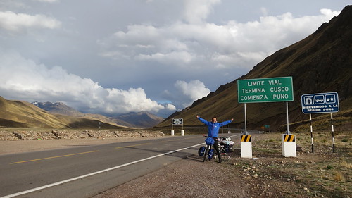 El problema comenzó ya en la noche, mientras dormíamos, cuando empezó un temporal muy fuerte. Lluvia y viento se encargaron de prácticamente arruinarnos el sueño. Más encima, como había estado tan bueno el tiempo antes de eso, dejamos un par de cosas fuera de la carpa y de las alforjas, las cuales se mojaron enteras, incluyendo ropa y zapatillas. El viento era tan fuerte que tuvimos que estar alerta por unas dos horas que no saliera volando nada. Mas encima, en medio del diluvio, sentiamos pasos de animales cerca de nosotros, pero con lo fuerte de la lluvia era muy dificil poder divisar algo. En fin. Al otro día amaneció por suerte con mucho sol así que nos quedamos un par de horas secando todo lo que se mojo por la noche. Así seguimos camino al sur, sin embargo, debido a las repetidas lluvias (de esas que pareciera que se cae el mundo) no pudimos avanzar lo que teniamos planeado. Un día muy especial fue el quinto, en donde después de un agotador pedaleo, viento, frio e incluso granizos, llegamos al punto más alto de lo que va del viaje: el paso «Abra la Raya», con casí 4500 metros de altura.